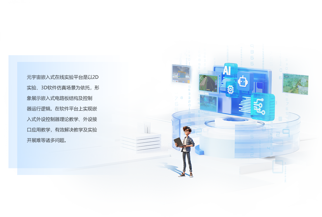 歷時5年打造元宇宙實驗中心,以2D實驗、3D軟件仿真場景為依托,形象展示嵌入式 電路板結構及控制器運行邏輯。在軟件平臺上實現嵌入式外設控制器理論教學、外設 接口應用教學,有效解決教學及實驗開展難等諸多問題。實訓項目