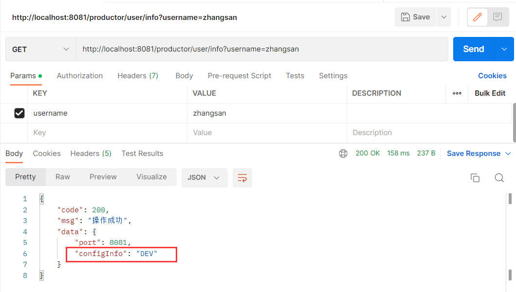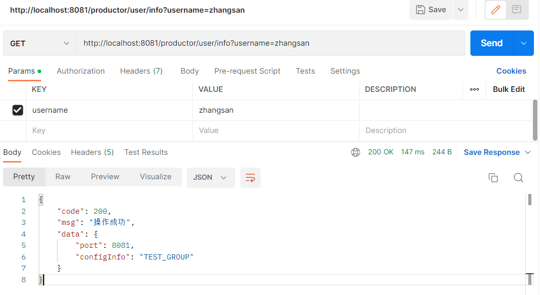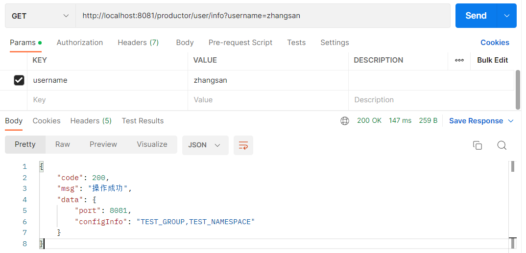 啟動(dòng)springboot項(xiàng)目,使用postman通過(guò)消費(fèi)者遠(yuǎn)程訪問(wèn)接口,可以成功返回結(jié)果: