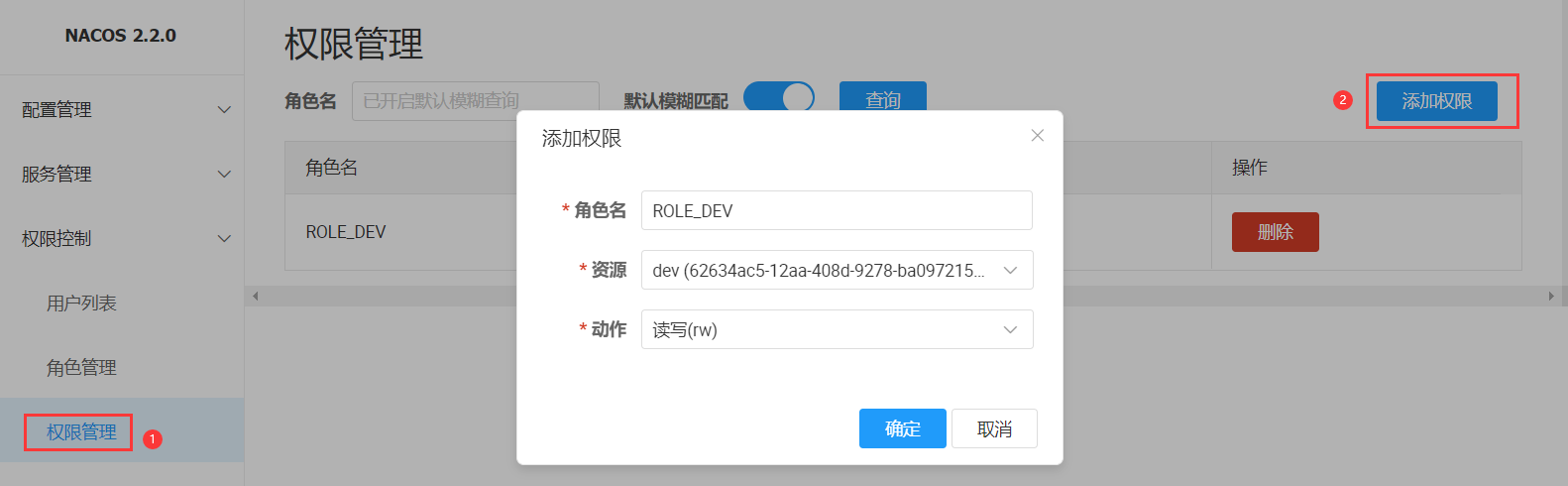 在Nacos頁(yè)面上點(diǎn)擊權(quán)限管理,在管理頁(yè)面點(diǎn)擊添加權(quán)限