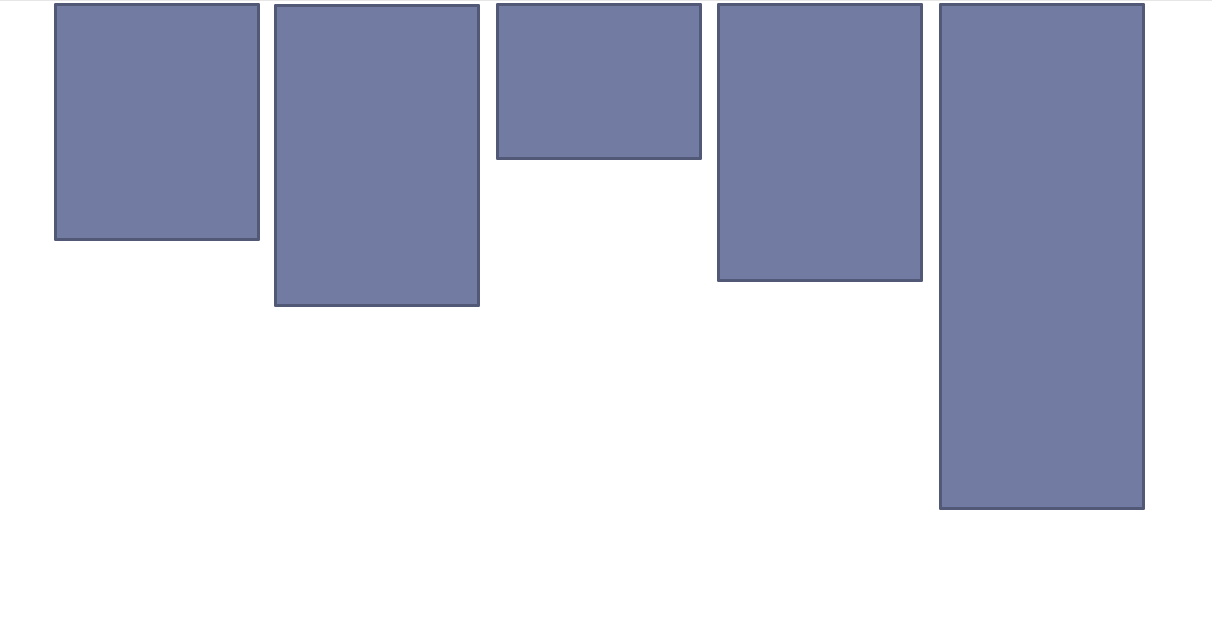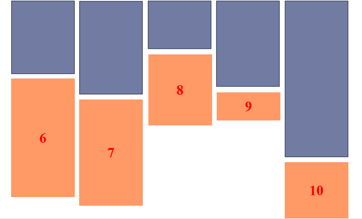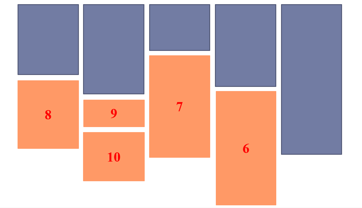 但這樣下去可能會導致每列之間的高度差距越來越大,并不符合實際瀑布流效果要求,在瀑布流中,從第六張圖片開始,接下去的每一張圖片都應該放在高度最低的那一列圖片下方。如下圖: