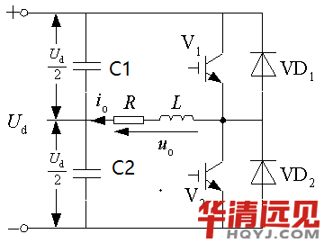V1和V2柵極信號(hào)在一周期內(nèi)各半周正偏、半周反偏,兩者互補(bǔ),輸出電壓uo為矩形波,幅值為Um=Ud/2 。