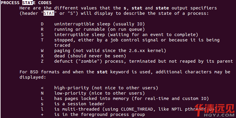 此時父進程3538狀態(tài)為R+而子進程狀態(tài)為Z+,通過查看ps命令文檔可的如下說明: