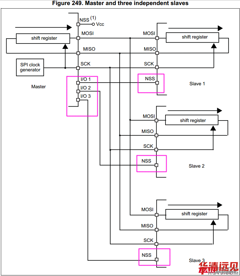看見上圖沒?知道NSS是干啥的了吧?SPI的多機通信就是這樣了!特別注意粉色框的NSS的接法和用法!很重要哦!其他的一切都是按照SPI標準協議來通信的!就不多廢話了。嘿嘿!