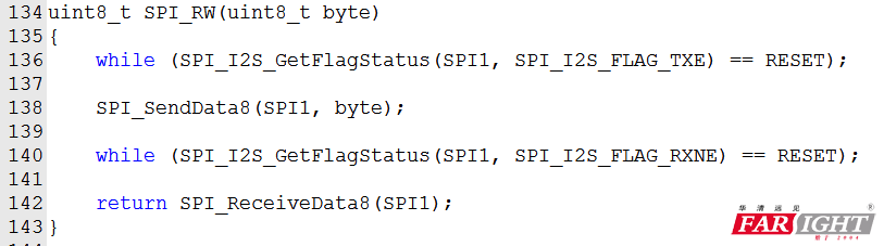 上面就是讀寫函數了!四句話解決!是不是很簡潔?嘿嘿!肯定是下班等待發送標志空閑,然后再SPI_SendData8()發送數據啦!因為是全雙工的嘛,所以每發送出去1bit數據,MCU也會接收到1bit的數據,只是這些事咱不用考慮,因為MCU的SPI控制器已經給咱們干了。哈哈!所以發送了之后,就要該讀取了!但是總得等待接收標志位空閑吧!然后讀取就返回了!所以,對于SPI的通信,發送數據和讀取數據就是同一個函數實現嘍!但是,有一點要注意哦,SPI通信接收的數據是上一次的數據,啥意思呢??比如,咱發送一個命令(0x08),spi_data = SPI_SendData8(SPI1,0x08);這是返回的spi_data不是命令0x08所返回的結果數據,所以想要獲取命令0x08的返回數據,就要緊接著spi_data = SPI_SendData8(SPI1,0xff);這次才是命令0x08所返回的數據,這一點尤其要注意。