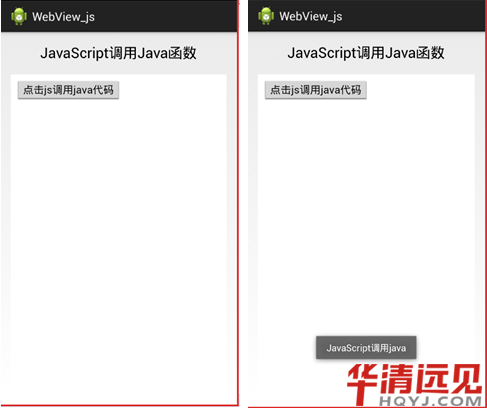 該HTML文件顯示的頁面只有一個“點擊js調用java代碼”的按鈕,點擊該按鈕后會觸發script中定義的點擊事件方法callAndroid(),該方法會調用java代碼中相對應的方法,從而實現JavaScript中調用android代碼。運行效果如下,點擊按鈕后會彈出一個Toast: