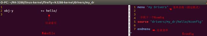 如上圖,即為mu_dr目錄下的Makefile文件和Kconfig文件的內容了。對于Makefile文件,一句話指引找到hello目錄。而對于Kconfig文件,因為my_dr目錄下可能要存在很多驅動程序,所以必須要建立好一個菜單,進行對各個驅動程序的選擇,所以第1行代碼就算建立名為my Drivers的菜單;第5行代表可以在相對路徑drivers/my_dr/hello/Kconfig找到Kconfig資源(注意,這里的路徑是相對于Linux內核源碼的頂層目錄的)。后的第7行表示使用關鍵字endmenu結束文件。