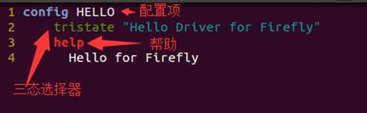 Config為配置關鍵字;HELLO為配置項;tristate為三態選擇器,此關鍵字在為上層提供菜單配置時,有三種選擇,分別是不編譯、編譯成內核鏡像和編譯成模塊驅動,除了這個關鍵字,還有另一個bool,這個不難理解,即為布爾類型,西游兩種選擇,編譯或者不編譯;help為幫助提示。這基本上是比較經典的格式了。所以通常在進行編寫這樣的配置時,通常的做法是參考Linux內核源碼中存在的Kconfig文件和Makefile文件,然后模仿他們的格式進行編寫。