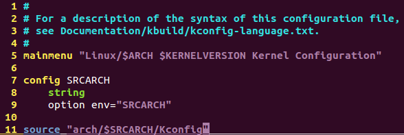 進入菜單之后我們可以看到有標題、有說明性的文字、和關(guān)鍵的選項。它們又是如何呈現(xiàn)在菜單中的呢,其實系統(tǒng)會讀取源碼目錄下面Kconfig文件,Kconfig文件是一個幫助內(nèi)核添加內(nèi)核選項的一個配置文件,打開這個Kconfig文件可以看到: