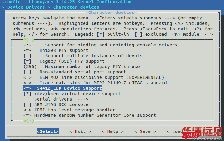 如果FS4412_LED Device Support選項被選中為*,則保存配置之后會在源碼目錄下面的.config文件中出現(xiàn)CONFIG_FS4412_LED的配置項并賦值為y;這個.config文件就是配置內(nèi)核后生成的保存配置信息的文件。