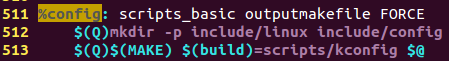 大家可能有疑問,這個界面是通過什么來生成的呢?其實也很容易會知道,當我們執(zhí)行make menuconfig后,肯定會執(zhí)行Makefile,那么我們打開Makefile文件來尋找menuconfig這個目標,但是是搜索不到的,這里有個技巧,我們使用%config來搜索,%是通配符的意思,會搜索到相關(guān)目標: