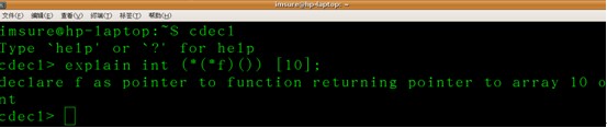 int (*f) ( int, float ); 前者把f聲明為一個函數指針,它所指向的函數接受兩個參數,分別是一個整型數和浮點型值,并返回一個整數。 后者把g聲明為一個數組,數組的元素類型是一個函數指針,它所指向的函數接受兩個參數,分別是一個整型數和浮點型值,并返回一個整型指針。盡管原型增加了聲明的復雜度,但是ANSI C還是大力提倡這個風格,因為這樣可以向編譯器提供一些額外的信息。 在中級篇的后,給大家推薦一個實用的C語言工具:cdecl,這個程序可用于所有UNIX操作系統,它可以將C語言的聲明翻譯成通俗易懂的語言,并可以將C語言聲明的語法轉換成為具體的C語言聲明。 如果你是用的是ubuntu操作系統,那么你只需要執行sudo apt-get install cdecl就可以把cdecl工具安裝到你的計算機上,對于別的unix操作系統,你同樣可以下載源碼包安裝(comp.sources.unix.newsgroup)。 在shell終端,我們執行cdecl就可以進入cdecl>提示符,然后輸入:explain int (*(*f)())[10]; 可以得到: