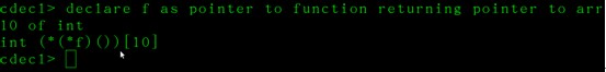 可以看到,cdecl為我們解釋了int (*(*f)()) [10]這個聲明的含義,有了這個工具,不管我們遇到怎樣詭異的C語言聲明,都可以從容應對了吧,呵呵! 當然,我們可以給cdecl一個聲明的語法,把上面一段解釋輸入進去,就可以看到: