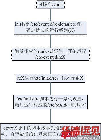 # Now run the START scripts for this runlevel. 這說明,當給rc腳本傳遞一個數字參數"X"的時候,它在經過一系列的設置后,將會開始執行/etc/rcX.d/下S開頭的腳本。這就過渡到下一個目錄/etc/rcX.d/了。 ls一下/etc/rcX.d/,發現里面全是一堆到/etc/init.d/中的腳本符號鏈接,不同的是它們的開頭加上了S和一個數字。熟悉原本init的人應該知道,S表示在啟動時運行,數字則表示執行的先后順序。其中有一個鏈接叫做S30gdm,gdm的意思是gnome display management,也就是用來啟動gnome桌面的。 綜上所述,upstart管理的ubuntu啟動過程如下圖所示: