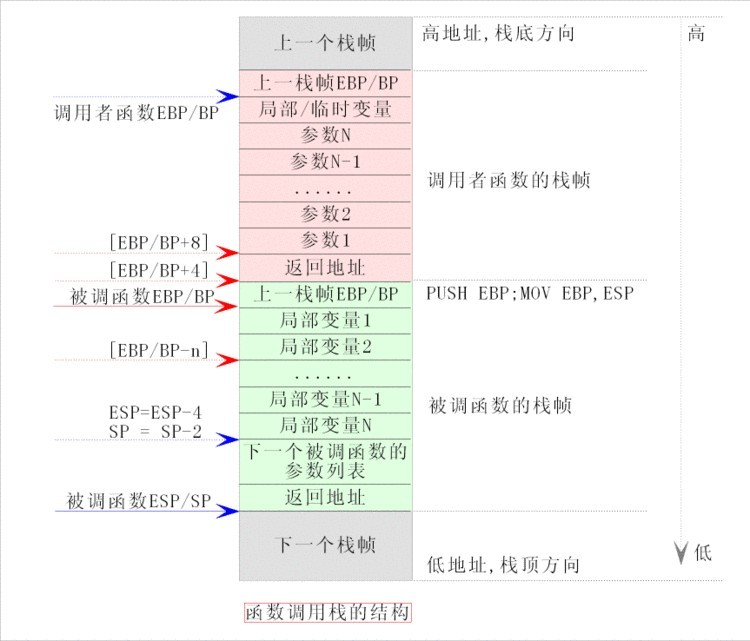 匯編/C語言中的'數據棧'跟數據結構中的'邏輯棧'類似都是遵循先進后出后進先出原則,但是在實際操作過程中的基本單位不同: 1.在數據結構中的'邏輯棧'按照使用者自己的需求定義大小及基本單位。例如可以存放10個char型,也可以存放20個結構體等。 2.在匯編或C語言本身的'數據棧'中棧大小由編譯器指定,遵循FIFO規則的基本單位是棧幀,即每調用一個函數都會有一個新的棧幀加入,而函數返回則以棧幀為單位出棧。 棧幀也叫過程活動記錄,是編譯器用來實現過程/函數調用的一種數據結構。其實就是一個函數執行的環境:函數參數、函數的局部變量、函數執行完后返回到哪里等等。 因此,在同一個棧幀內數據的訪問可以使隨機的,匯編中可以通過ebp 指針向上或向下任意偏移就可以訪問當前函數內部的所有局部變量,或向上偏移就可以訪問調用者對當前函數的傳參。(因為棧的增長空間是從高地址到低地址。) 下面是函數調用過程中的操作: 當發生函數調用的時候,棧空間中存放的數據是這樣的: 1、調用者函數把被調函數所需要的參數按照與被調函數的形參順序相反的順序壓入棧中,即:從右向左依次把被調函數所需要的參數壓入棧; 2、調用者函數使用call指令調用被調函數,并把call指令的下一條指令的地址當成返回地址壓入棧中(這個壓棧操作隱含在call指令中); 3、在被調函數中,被調函數會先保存調用者函數的棧底地址(push ebp),然后再保存調用者函數的棧頂地址,即:當前被調函數的棧底地址(mov ebp,esp); 4、在被調函數中,從ebp的位置處開始存放被調函數中的局部變量和臨時變量,并且這些變量的地址按照定義時的順序依次減小,即:這些變量的地址是按照棧的延伸方向排列的,先定義的變量先入棧,后定義的變量后入棧; 所以,發生函數調用時,入棧的順序為: