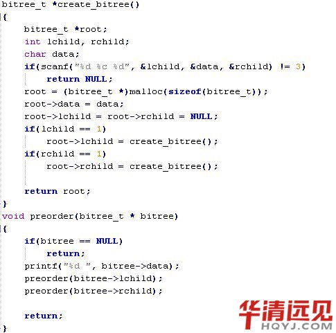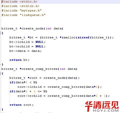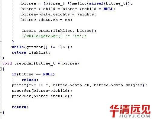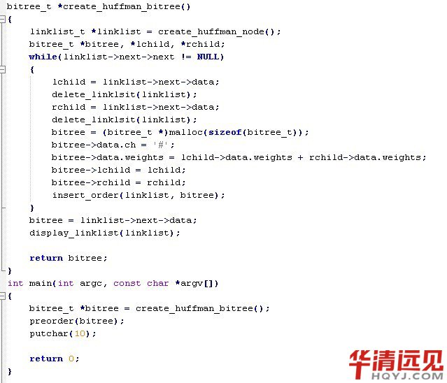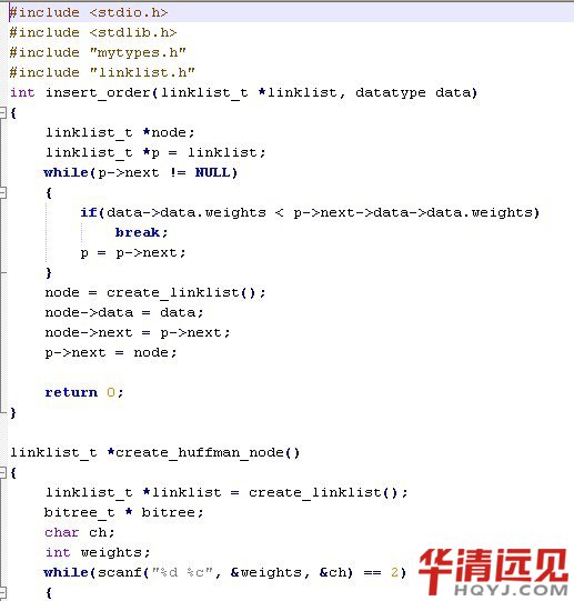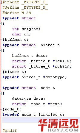 其中,(c)圖所示的二叉樹的帶權路徑長度小,這棵樹就是哈夫曼樹。可以驗證,哈夫曼樹的帶權路徑長度小。 那么我們應該如何構建一個哈夫曼樹呢?其實并不復雜: 1)首先構建一個葉子節點集合,這里我用鏈表來表示,每個節點在插入到鏈表中時是按照權值由小到大順序插入的。 2)首先判斷當前集合節點的個數是否大于1,如果不大于,則程序結束,集合里的節點即為創建好的哈夫曼樹的根節點,如果大于1,則轉至3 3)取出集合中前兩個節點(取出后集合中已經刪除掉這兩個節點),由這兩個節點構建一顆新樹,新樹的權值為這兩個節點之和。權值較小的節點為新樹的左孩子,較大的節點為新樹的右孩子。 4)將新樹按權值由小到大的順序插入到集合中,轉至2。 實現代碼如下: mytypes.h