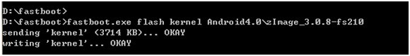 打開windows下的CMD,輸入下面命令,即可向NAND Flash燒寫內核。 >fastboot.exe flash kernel Android4.0\zImage_3.0.8-fs210