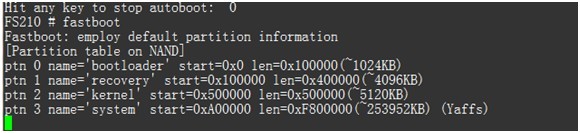 1.1.4. 燒寫Android文件系統 終端輸入“fastboot”,進入Fastboot下載模式: