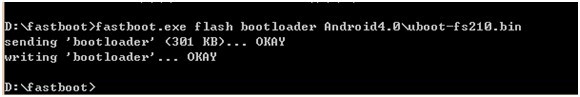 為了方便,拷貝“燒寫鏡像\Android4.0”到Fastboot目錄下,打開windows下的CMD,輸入下面命令,即可向NAND Flash燒寫u-boot。 >fastboot.exe flash bootloader Android4.0\uboot-fs210.bin