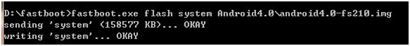 打開windows下的CMD,輸入下面命令,即可向NAND Flash燒寫Android文件系統。 >fastboot.exe flash system Android4.0\android4.0-fs210.img