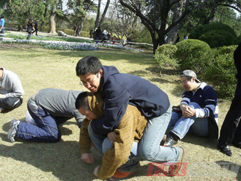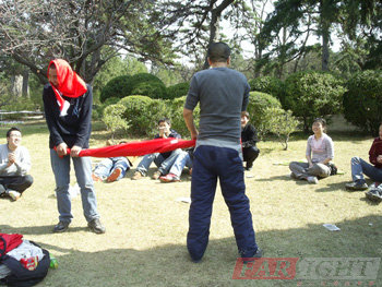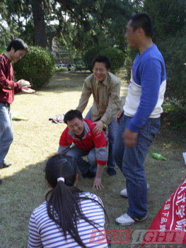 上山時感覺酸疼,下山時腿又發軟,但學員游玩的心情愈發濃起來。大家找一塊草坪,圍坐 下來,拿出事先準備好的報紙,四個對比賽撕報紙。圖片(七)猜猜二位男生為何如此親密接觸? 圖片(八) 師生一起做游戲笑得如此開心。圖片(九)旁邊的兩位同學在認真檢查什么?圖片(十)搞笑的一幕也在此上演,來個男扮女裝,如此懲罰輸的一組讓所有學員笑翻了天。他倆在表演《纖夫的愛》,男主角還是比較高大,女主角也還算嬌小。