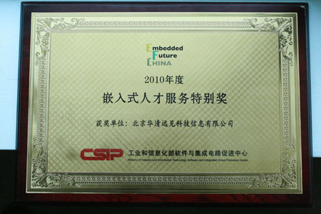 據主辦方CSIP透露,舉辦此次評選活動的目的是為了激發嵌入式應用領域的創新精神,發掘外新具代表性的嵌入式技術及應用解決方案,促進嵌入式技術在各行各業的廣泛應用,推進兩化融合、3C融合、傳統產業升級的發展進程。而作為產業發展根本要素的人才培養,在本次大會上更是受到了各位專家和主管行業的特別關注。大會專家評審團將特別設立的“嵌入式人才服務特別獎”頒發給華清遠見的理由是:作為早從事嵌入式高端培訓的專業機構,華清遠見憑借其敏銳的洞察力和卓越的市場前瞻性,始終緊跟行業發展趨勢和企業需求,借助與ARM、微軟、Atmel、Intel等企業卓有成效的合作,從2005年開始,華清遠見平均每年源源不斷地向嵌入式行業輸送2000多名優秀工程師,連續5年市場份額遙遙。至2009年底,華清遠見累積培訓學員人數已超過一萬兩千名,為嵌入式行業健康快速發展提供了強有力的保障。