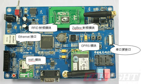 作為平臺控制核心,進行數據的接收、分析與處理。其上有GPRS模塊、WiFi模塊、RFID射頻模塊和ZigBee模塊。網口可用于遠程登錄控制的實驗。