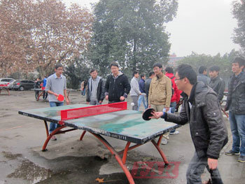稍作休息之后,是激動人心的乒乓球決賽。經過淘汰賽,組長對本組成員的實力有了進一步的認識,由于是團體賽,出場的順序顯得尤其的重要。在周圍觀眾的加油助威聲中,比賽已經進行到了第三局,因為前兩局都由第三組獲勝,所以這一局對第一組成員來說顯得尤其的重要。而第三組的成員們更想贏了這場比賽,結束整個賽程。場上的比分一直咬的很緊,裁判盯著桌案上的小小乒乓球,小心的統計著分數!百慄c!”有人喊了出來,而大家的心也隨著這一聲叫喊,跟著緊張起來。終于,第一組扳回一局。接下來的一局,第三組派出了具實力的選手組長高磊,而第一組也派出了該組高手中的高手李癸佑。一場精彩的比賽正式上演。在眾人的加油聲,喝彩聲,歡呼聲中,第三組終于取得了乒乓球團體賽的勝利。