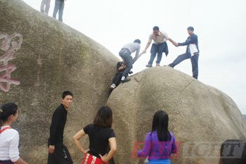 經過了一段艱苦的爬行后,終于到達了山頂。學員們都興奮的在呼叫,貪婪的呼吸著新鮮空氣,飽覽著迷人的景色:往東邊遠望,群山連綿起伏,好似奔騰的綠浪。而西邊呢,高樓聳立,路上的車輛川流不息。俯視,水庫的全景盡收眼底,草是綠的,水是綠的,樹是綠的,真是一片綠意。大伙們登頂成功的喜悅情不自禁地化為了吶喊與歡呼,那時那刻,大家喜悅歡呼、爭相合影留念,留住這美麗瞬間。