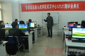 2013年4月19日華清遠見嵌入式武漢中心12101期畢業典禮在武漢工程大學科技孵化器大樓804-1舉行。參加本次畢業典禮的嘉賓有:項目指導老師莊老師、就業指導老師周老師、班主任王老師,彭老師等。