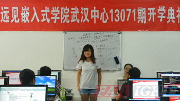 接著大家以熱烈的掌聲歡迎中心負責人周老師為大家作開學典禮致辭,周老師對華清遠見教育科技集團的企業文化和發展歷程進行了簡短的介紹,分析了嵌入式行業的專業前景及發展方向,并強調了用人單位對崗位人員技能的具體要求,告訴大家來到這里學習,就要本著一個良好的心態,刻苦的精神,要時刻以一個職業人的標準來要求自己。在這4個月的學習過程中,學習強度會非常大,希望能夠找到好的適合自己的學習方法,調整好心態,一定要下定決心去學習,一個有決心的人才會找到他的道路。大家要對自己有信心,信心不是天生就有的,但是可以去培養,要相信自己一定能學好。后周老師祝愿各位同學能在四個月之后都可以得到自己想要的結果。