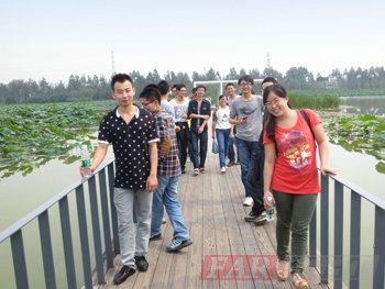 午餐過后,休息了半個小時,我們沿著賞荷路,前往濕地公園。夏已盡,蓮蓬探出了水面,但荷花還沒有完全凋謝,睡蓮還美美的躺在水上,有紅色的蜻蜓立在荷葉上,引來不少學員圍觀,拿出相機抓拍,小家伙很配合,一動不動,有學員懷疑它的生命狀態,伸手捧起水灑向它,由于受到了驚嚇,蜻蜓急急的飛走了,這時還在認真拍照的學員對剛剛灑水的學員表示不滿,而他卻擺好POSE,說到:“別生氣了,大不了我委屈點兒,讓你拍好了。”俏皮的話語、生動的表情把周圍的學員都逗樂了,又有幾個學員加入,笑著說到:“好啊,好啊,我們也來吧!”就這樣,大家一路上有說有笑,趣事不斷。