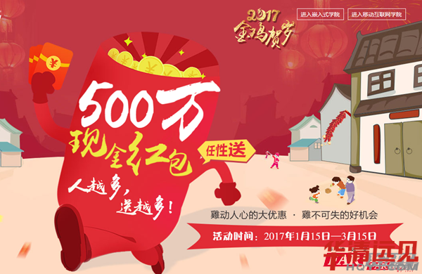 凡是在2017.1.15-3.15期間,報名華清遠(yuǎn)見嵌入式、Android、HTML5、VR/AR、UI任意一門就業(yè)班課程的學(xué)生,都能立即拿到千元現(xiàn)金紅包!具體紅包數(shù)額為:
