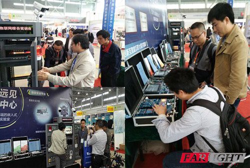 此次參展的實驗箱有物聯網和嵌入式典型綜合科研平臺(FS_WSN4412)、配置為靈活的ARM微控制器+ARM微處理器多核心代表(FS_4412M4)、有硬件智能化標志的智能穿戴實驗箱(FS_WARE)、還有炫技神器可航拍的四軸飛行器(FS_Qca)、智能機器人小車(FS_ICar)、創新性實訓平臺智能醫療實訓系統(FS_WIT120)和集家居安防與智能農業與一體的物聯網綜合實訓臺(FS_SXT)。 展會現場非常熱鬧,絡繹不絕的與會者對展示的設備興趣十足,親身體驗產品,并與華清遠見研發工程師探討產品應用及技術等相關問題。