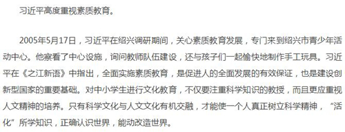 “全面實施素質教育,是促進人的全面發展的有效保證,也是建設創新型的重要基礎。” “對中小學生進行文化教育,不僅要注重科學知識的教授,而且更應重視人文精神的培養。” “只有科學文化與人文文化有機交融,才能使一個人真正樹立科學精神,“活化”所學知識,正確認識世界,能動改造世界。”