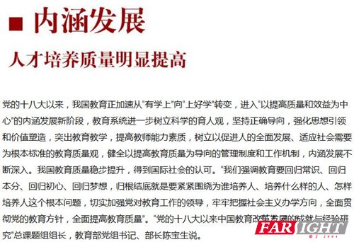 “優先發展教育事業,建設教育強國是中華民族偉大復興的基礎工程。” “要全面貫徹黨的教育方針,落實立德樹人根本任務,發展素質教育。” “完善職業教育和培訓體系,深化產教融合、校企合作。”