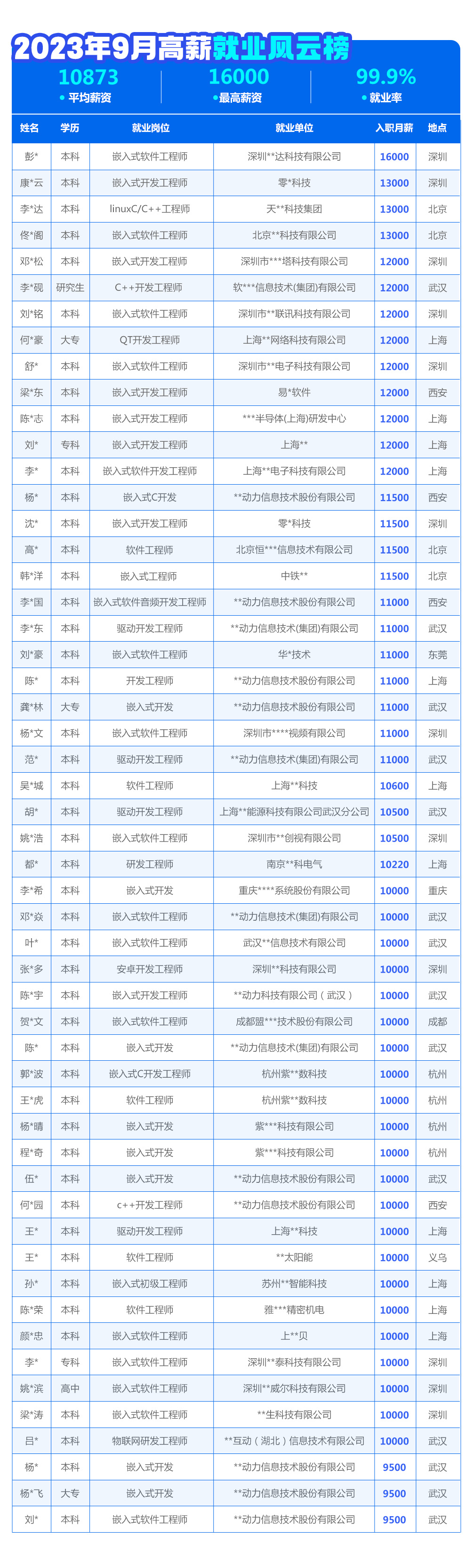 · 嵌入式10月就業(yè)榜萬眾一“薪” 全國平均薪資9645.5元