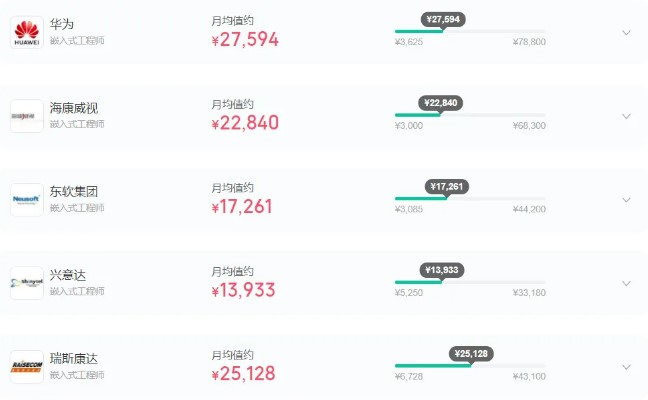 在一線大廠中,嵌入式相關崗位的薪資會更高。華為、海康威視等業內知名大廠的嵌入式工程師薪資遠超其他行業,其中華為嵌入式工程師月平均薪資高達27K,海康威視月平均薪資可達22K。