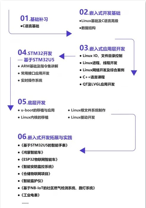 作為20年持續深耕嵌入式職業教育品牌,華清遠見針對當下企業內嵌入式崗位需求全面升級課程知識體系。從嵌入式開發基礎到嵌入式進階實戰,深入講解嵌入式體系中的熱門技術。