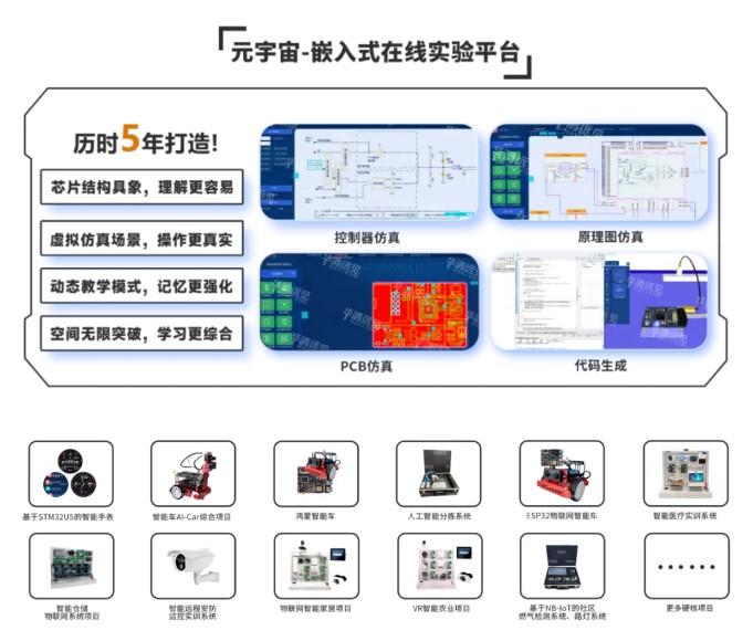 華清遠見自主研發元宇宙嵌入式在線實驗平臺,為開發者解決無法脫離硬件學習、芯片內部結構抽象、系統性學習難三大問題,讓教與學更簡單靈活。除理論知識外,平臺配套十余款企業級項目供開發者實踐操作,理論實踐共同幫助開發者全面掌握嵌入式全領域技術。