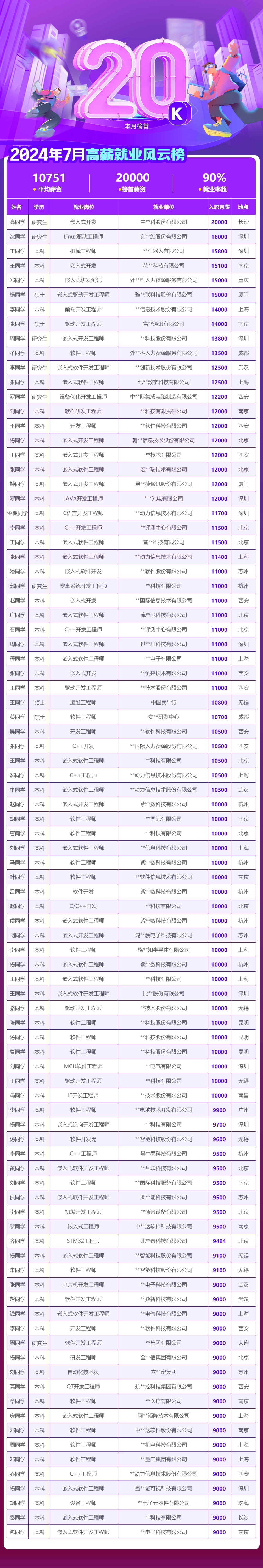 為了讓大家深入了解嵌入式及相關崗位的薪資情況,華妹給大家直觀地展示一下華清遠見2024年7月高薪就業學員的信息,平均薪資1W+,最高薪資20000,就業率超90%。