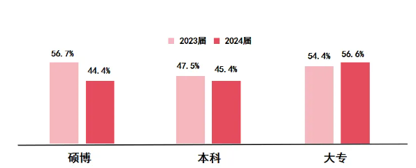 今年3月下旬至4月中旬據智聯招聘統計:今年碩博畢業生offer獲得率為44.4%,較去年下降了約21.7%。