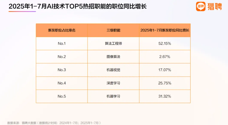 AI技術(shù)職位類別占比排名中,算法工程師、圖像算法、機(jī)器視覺、深度學(xué)習(xí)、機(jī)器學(xué)習(xí)躋身前五。從2025年1-7月其同比增長來看,算法工程師增長最快,超50%。