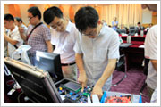 高校教師體驗華清遠見試驗箱 華清遠見自主研發展臺產品演示 參會高校教師閱讀華清遠見自己出版的圖書 ARM公司移動市場部經理Eric Wang為會議抽取幸運獎 北京航空航天大學軟件學院副院長康一梅公布獲獎者名單