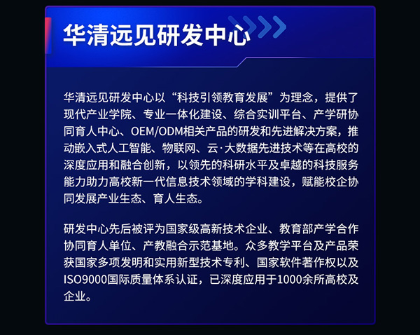 華清遠見教育科技集團,是一家集產學研用于一體的科技驅動型高端教育服務品牌,華清遠見研發中心以“科技引領教育發展”為理念,提供了現代產業學院、專業一體化建設、綜合實訓平臺、產學研協同育人中心、OEM/ODM 相關產品的研發和先進解決方案,推動嵌入式人工智能、物聯網、云·大數據先進技術等在高校的深度應用和融合創新,并先后被評為國家級高新技術企業、教育部產學合作協同育人單位、產教融合示范基地,眾多教學平臺及產品已深度應用于 1000 余所高校及企業。