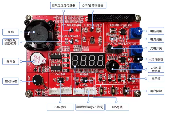 資源擴展板提供基于I2C總線的溫濕度傳感器、環(huán)境光感知、心率/脈搏測量。基于模數(shù)轉(zhuǎn)換接口的電壓/電流采集;贓XTI事件/中斷控制類型的人體紅外、光電開關(guān)、火焰感知傳感器;赟PI總線的數(shù)碼管驅(qū)動電路。基于PWM控制的風扇、蜂鳴器、震動馬達。基于GPIO的按鍵、LED指示燈。基于異步串行通信的485總線電平轉(zhuǎn)換;诳刂破骶钟蚓W(wǎng)總線的CAN電平轉(zhuǎn)換等外設(shè)。資源擴展板主要用于微控制器入門外設(shè)的使用及項目案例的應(yīng)用開發(fā)學習。
