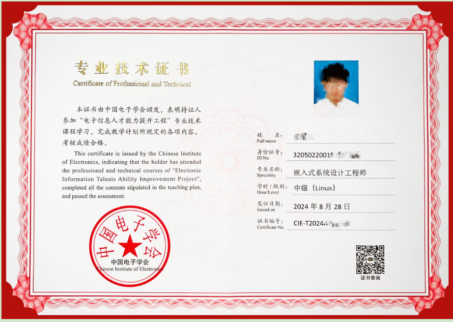 完成嵌入式Linux中級課程學習并考核通過,即可獲得中國電子學會頒發的《嵌入式系統設計工程師-中級(Linux)》認證證書。該證書可作為專業技術人員考核評價、崗位聘用、職稱評聘和執業注冊的重要依據。