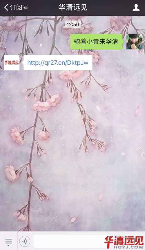 2. 進入公眾號,在對話框內輸入“騎著小黃來華清”,即可獲得領取鏈接;