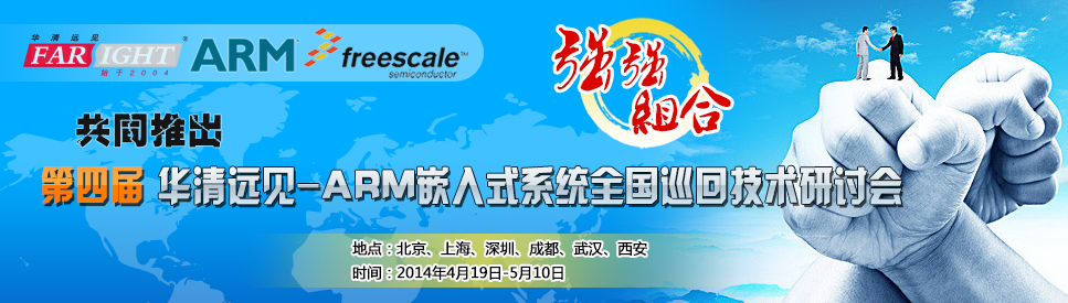 2014年4月-5月,華清遠(yuǎn)見(jiàn)教育科技集團(tuán)攜手全球的半導(dǎo)體知識(shí)產(chǎn)權(quán) (IP) 提供商ARM公司及全球的半導(dǎo)體公司飛思卡爾攜手舉辦華清遠(yuǎn)見(jiàn)-ARM嵌入式系統(tǒng)全國(guó)巡回技術(shù)研討會(huì)。從4月19日開(kāi)始,深圳、成都、上海、武漢、西安、北京相繼開(kāi)講,至5月10日完美落幕。 2014年是華清遠(yuǎn)見(jiàn)聯(lián)合ARM及其他全球公司聯(lián)合推出該系列活動(dòng)的第四個(gè)年頭,通過(guò)前期1個(gè)半月時(shí)間的預(yù)熱,全國(guó)六大城市參與人數(shù)超過(guò)了1600人,連續(xù)4屆通過(guò)該系列講座收益的人群超過(guò)了5000人! 本次系列講座分為三個(gè)方面的專題:1、ARM新技術(shù)發(fā)展及典型應(yīng)用案例。2、飛思卡爾Kinetis系列ARM Cortex微處理器介紹及典型應(yīng)用。3、ARM處理器的行業(yè)應(yīng)用與關(guān)鍵技術(shù)分析。講座場(chǎng)場(chǎng)爆滿,座無(wú)虛席!