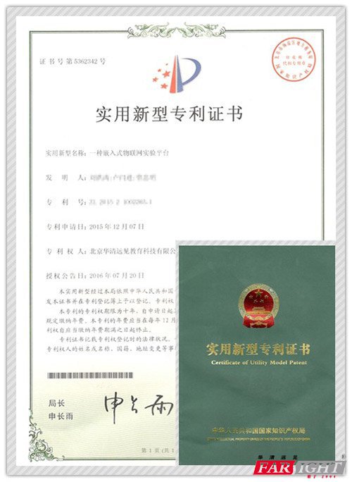 2016年8月,由華清遠見研發中心自主研發的“一種嵌入式物聯網實驗平臺”(物聯網實驗平臺FS_WSN4412)榮獲知識產權局頒發的《實用新型專利證書》。這標志著華清遠見在物聯網實驗領域取得了進一步的發展,實現了從實驗到實用產品的過渡。
