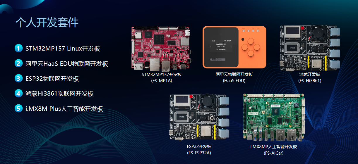 在個人開發套件業務模塊,華清遠見研發中心全新發布五款新品——STM32MP157 Linux開發板、阿里云HaaS EDU物聯網開發板、ESP32物聯網開發板、鴻蒙Hi3861物聯網開發板、i.MX8M Plus人工智能開發板。這五款產品中,濃縮了阿里、華為、恩智浦、ST等名企前沿技術,不僅可以豐富個人愛好者的開發體驗,在項目技術上也到達了一個新的高度。